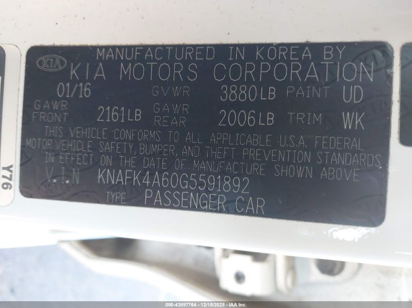 2016 KIA FORTE - KNAFK4A60G5591892, колір - Білий, 1.8, Бензин, Передній привід із США