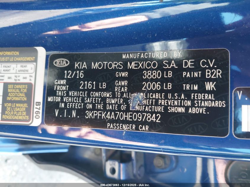 2017 KIA FORTE - 3KPFK4A70HE097842, колір - Синій, 2.0, Бензин, Передній привід із США