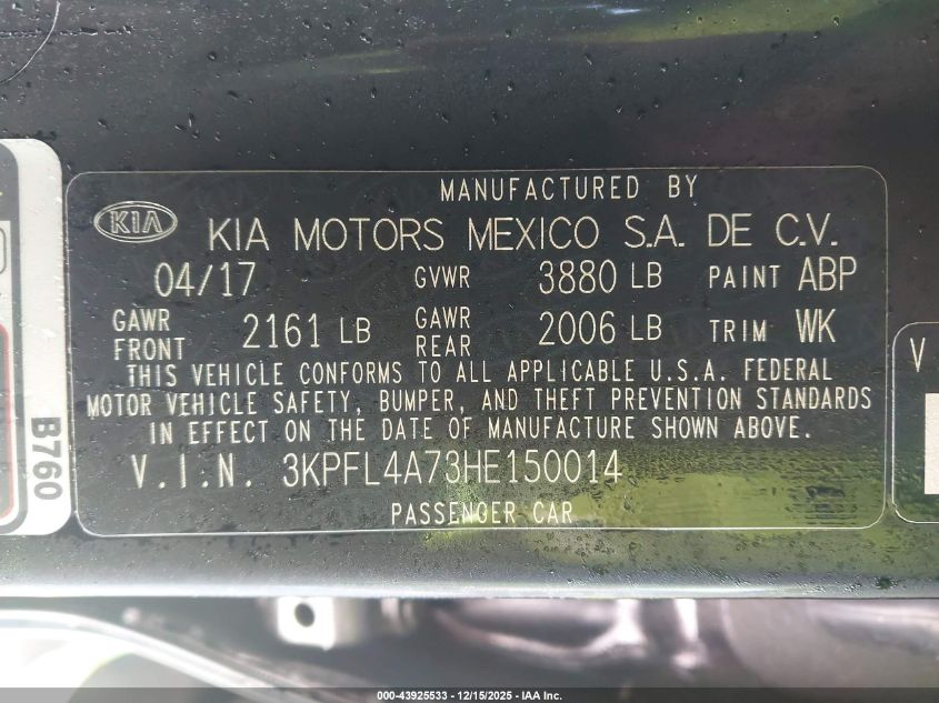 2017 KIA FORTE - 3KPFL4A73HE150014, колір - Чорний, 2.0, Бензин, Передній привід із США