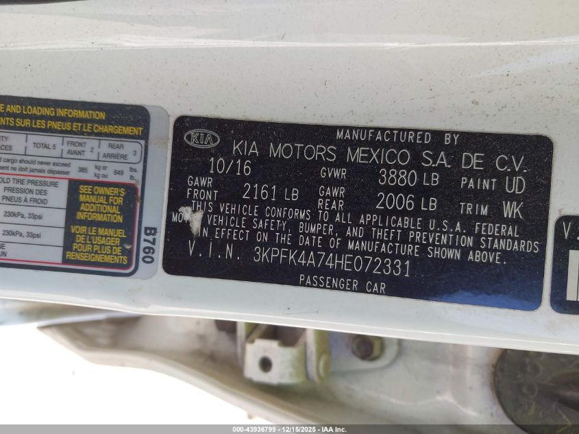 2017 KIA FORTE - 3KPFK4A74HE072331, колір - Білий, 2.0, Бензин, Передній привід із США