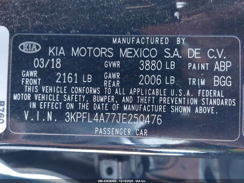 2018 KIA FORTE - 3KPFL4A77JE250476, колір - Чорний, 2.0, Бензин, Передній привід із США