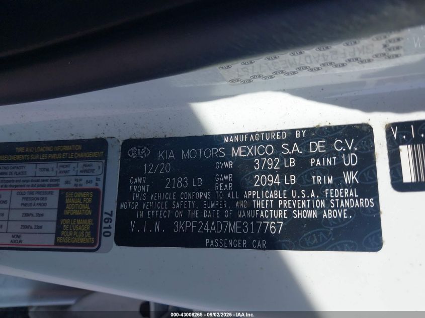 2021 KIA FORTE - 3KPF24AD7ME317767, колір - Білий, 2.0, Бензин, Передній привід із США