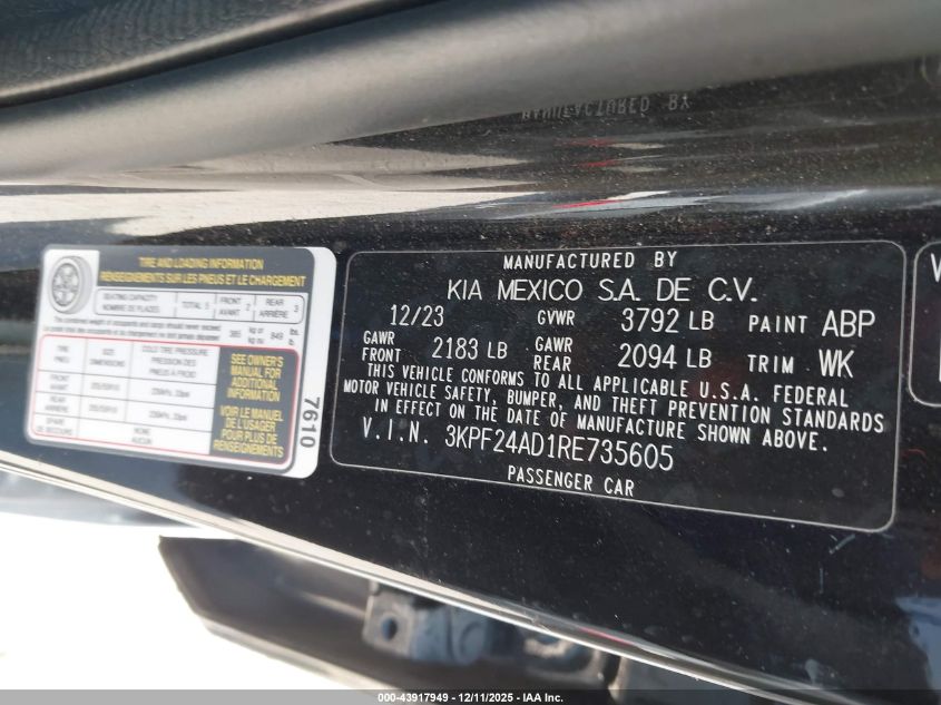 2024 KIA FORTE - 3KPF24AD1RE735605, колір - Чорний, 2.0, Бензин, Передній привід із США