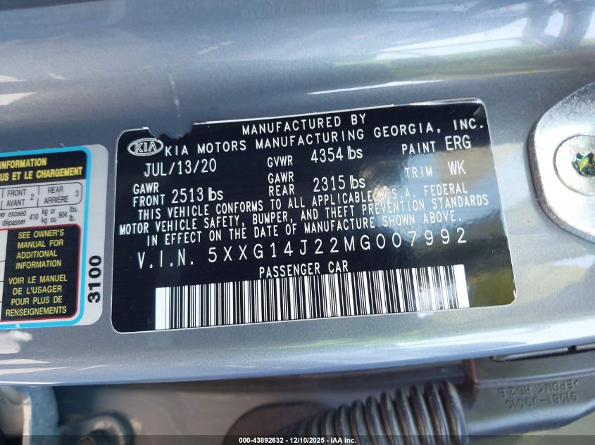 2021 KIA K5 - 5XXG14J22MG007992, колір - Сірий, 1.6, Бензин, Передній привід із США