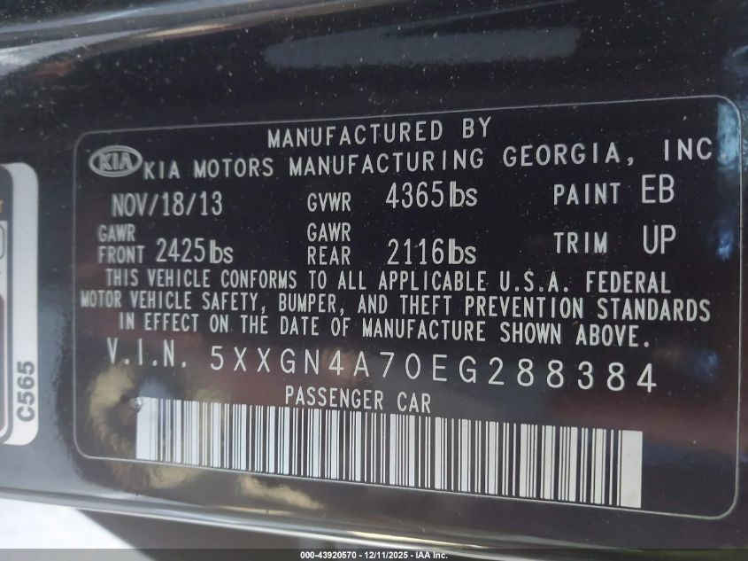 2014 KIA OPTIMA - 5XXGN4A70EG288384, колір - Чорний, 2.4, Бензин, Передній привід із США