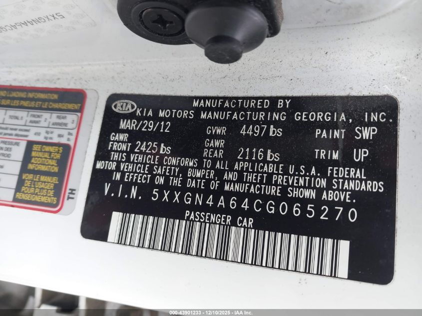 2012 KIA OPTIMA - 5XXGN4A64CG065270, колір - Білий, 2.0, Бензин, Передній привід із США