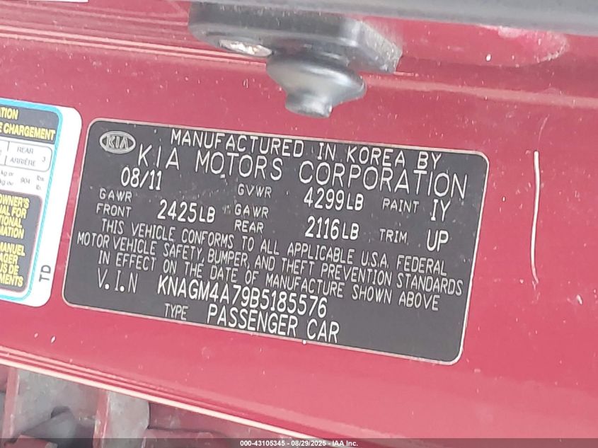 2011 KIA OPTIMA - KNAGM4A79B5185576, колір - Бургундія, 2.4, Бензин, Передній привід із США