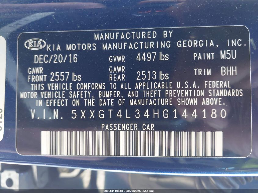 2017 KIA OPTIMA - 5XXGT4L34HG144180, колір - Синій, 2.4, Бензин, Передній привід із США