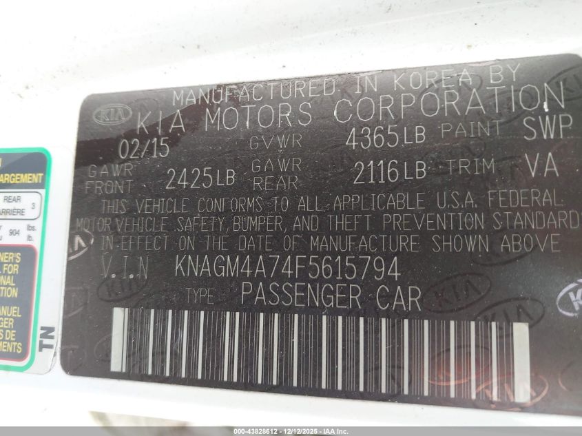 2015 KIA OPTIMA - KNAGM4A74F5615794, колір - Білий, 2.4, Бензин, Передній привід із США
