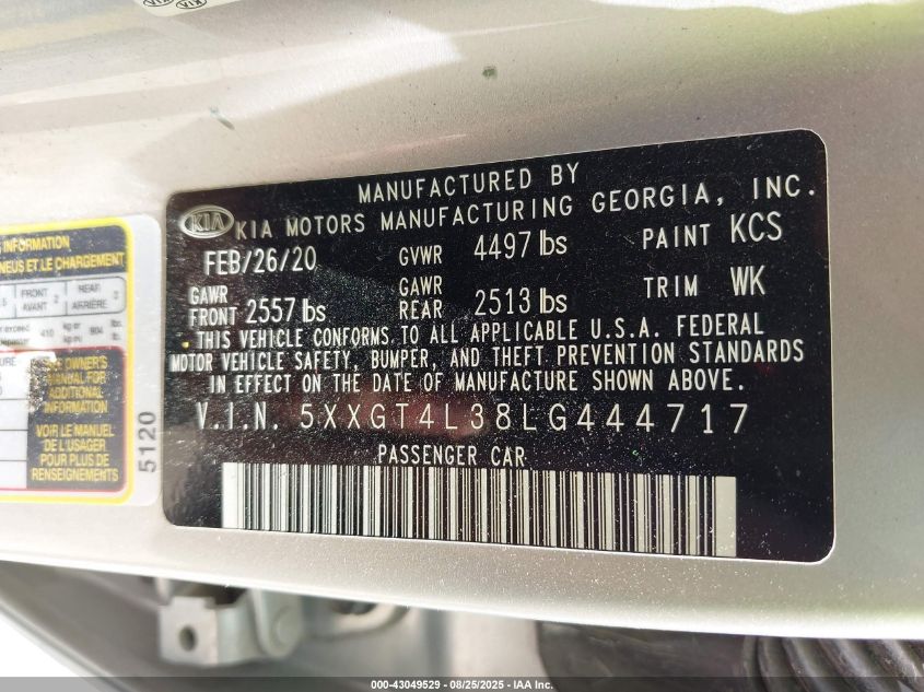 2020 KIA OPTIMA - 5XXGT4L38LG444717, колір - Срібний, 2.4, Бензин, Передній привід із США