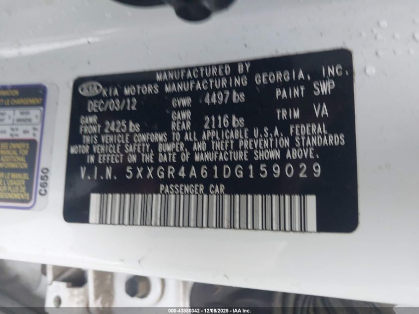 2013 KIA OPTIMA - 5XXGR4A61DG159029, колір - Білий, 2.0, Бензин, Передній привід із США