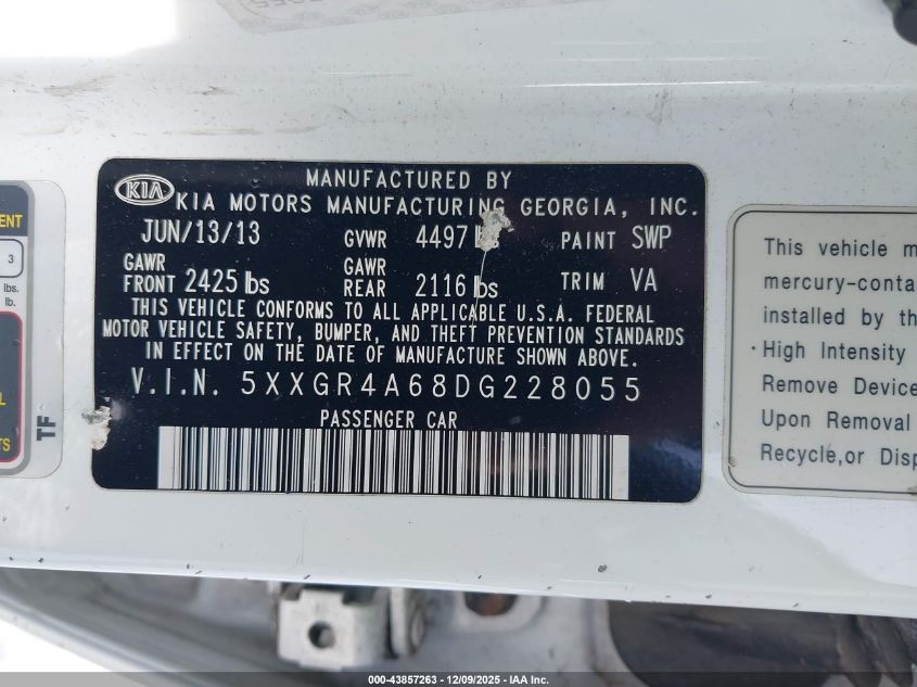 2013 KIA OPTIMA - 5XXGR4A68DG228055, колір - Білий, 2.0, Бензин, Передній привід із США