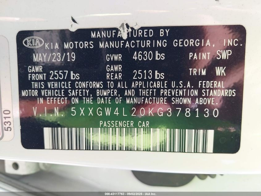 2019 KIA OPTIMA - 5XXGW4L20KG378130, колір - Білий, 2.0, Бензин, Передній привід із США