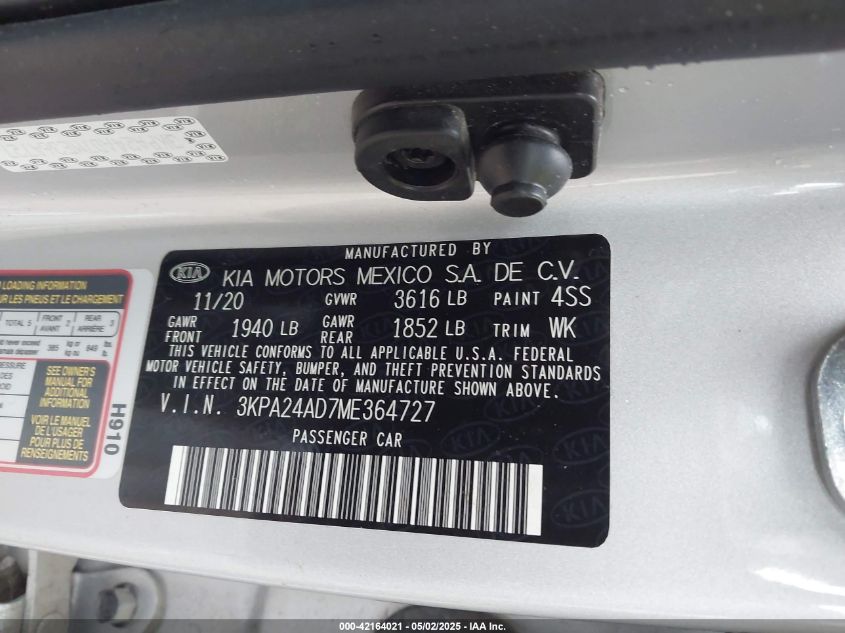 2021 KIA RIO - 3KPA24AD7ME364727, колір - Срібний, 1.6, Бензин, Передній привід із США
