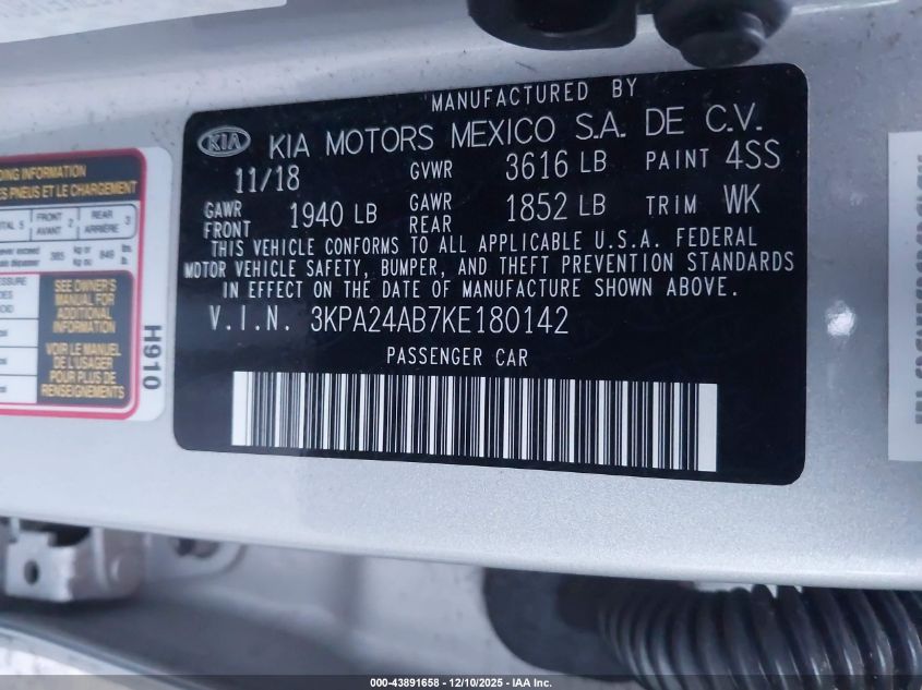 2019 KIA RIO - 3KPA24AB7KE180142, колір - Срібний, 1.6, Бензин, Передній привід із США