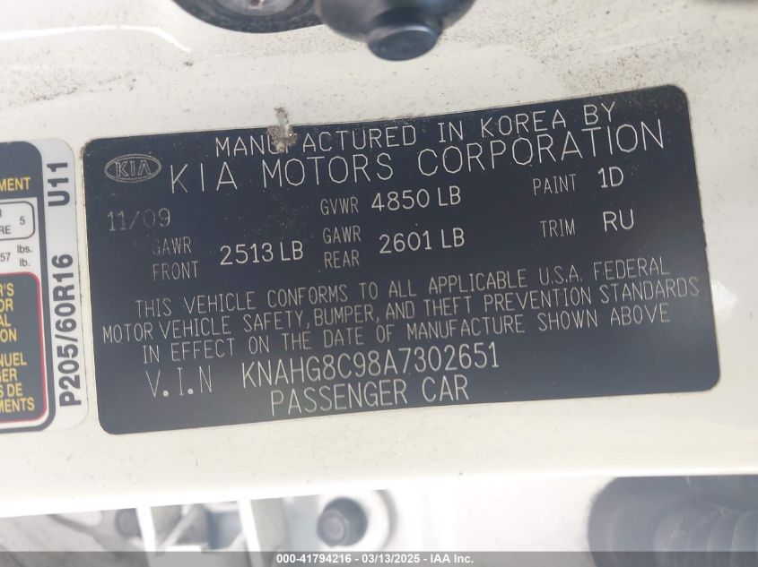 2010 KIA RONDO - KNAHG8C98A7302651, колір - Білий, 2.4, Бензин, Передній привід із США