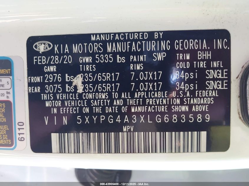 2020 KIA SORENTO - 5XYPG4A3XLG683589, колір - Білий, 2.4, Бензин, Передній привід із США