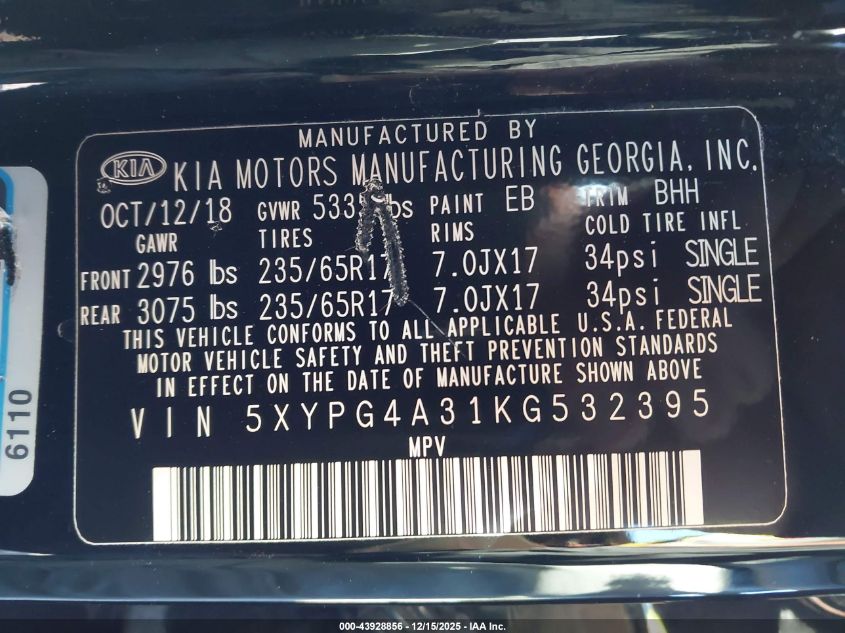 2019 KIA SORENTO - 5XYPG4A31KG532395, колір - Чорний, 2.4, Бензин, Передній привід із США
