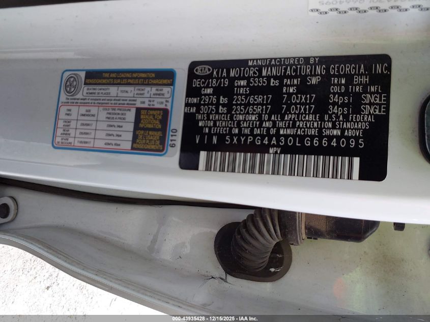 2020 KIA SORENTO - 5XYPG4A30LG664095, колір - Білий, 2.4, Бензин, Передній привід із США