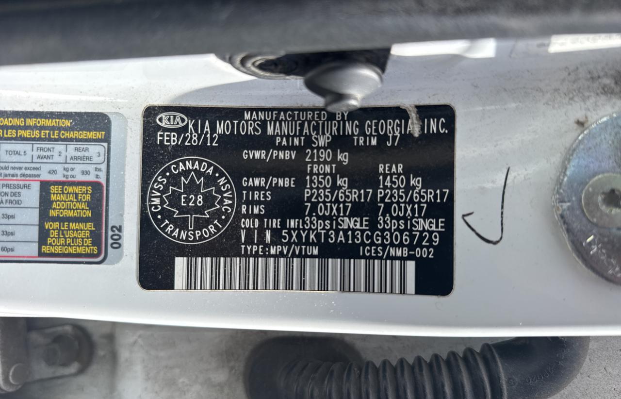 2012 KIA SORENTO - 5XYKT3A13CG306729, колір - Білий, 2.4, Бензин, із США
