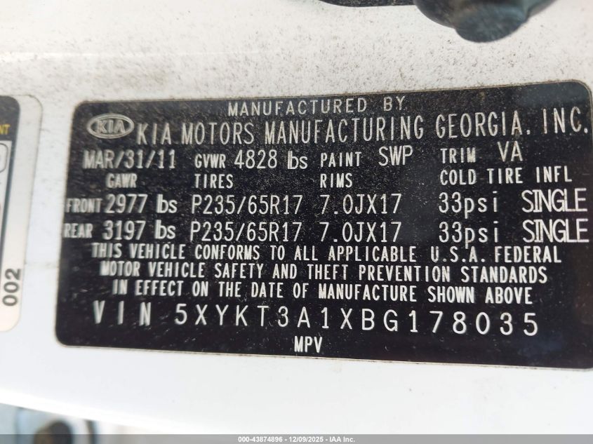 2011 KIA SORENTO - 5XYKT3A1XBG178035, колір - Білий, 2.4, Бензин, Передній привід із США