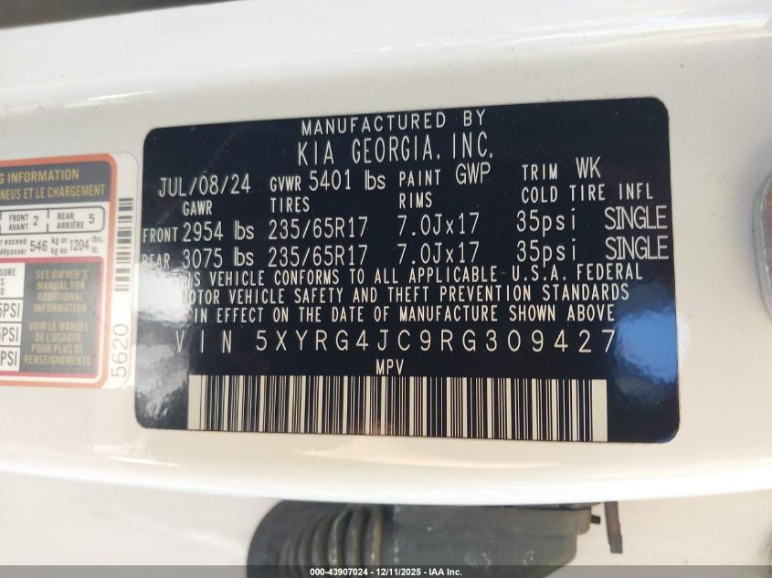 2024 KIA SORENTO - 5XYRG4JC9RG309427, колір - Білий, 2.5, Бензин, Передній привід із США