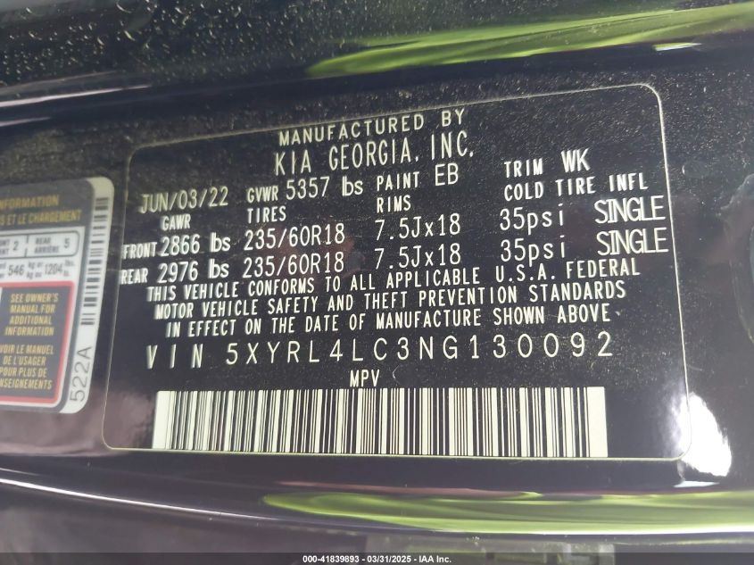 2022 KIA SORENTO - 5XYRL4LC3NG130092, колір - Чорний, 2.5, Бензин, Передній привід із США