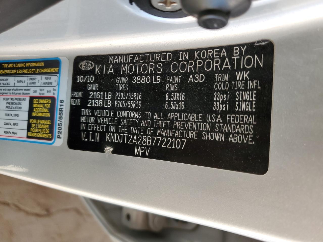 Колір СрібнийЦиліндри 4VIN KNDJT2A28B7722107Стан Заводиться та їде (перевірено)Ушкодження Передня або задня