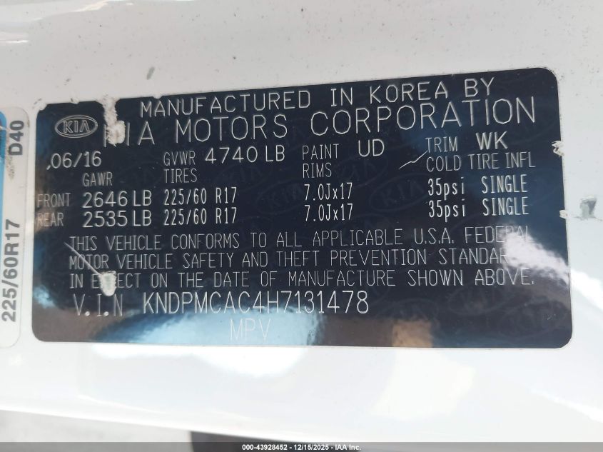 Колір БілийЦиліндри 4Привід Повний привідVIN KNDPMCAC4H7131478Стан СтаціонарноУшкодження Передня або задня