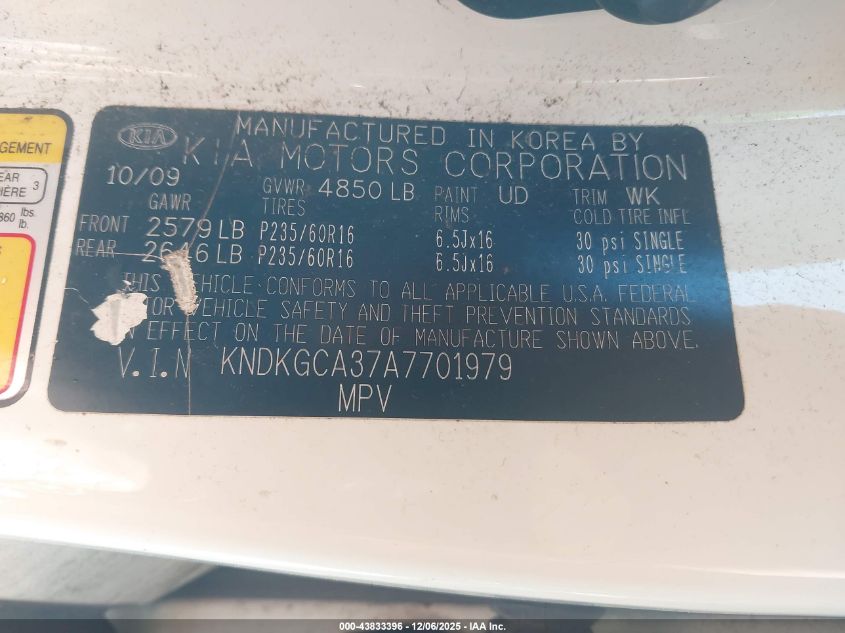 Колір БілийЦиліндри 6Привід Повний привідVIN KNDKGCA37A7701979Стан Заводиться та їде (перевірено)Ушкодження З боківДата аукціона 2025-12-19