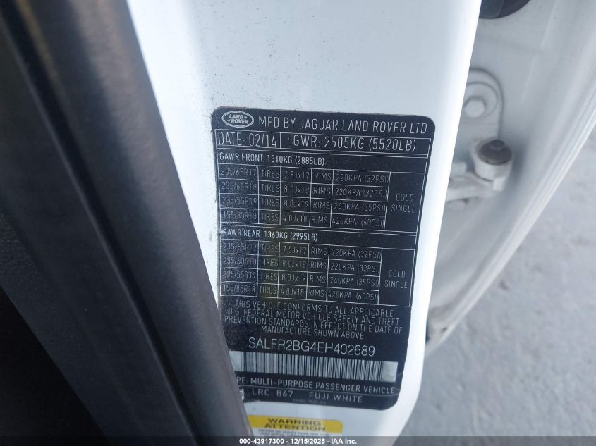 Колір БілийЦиліндри 4Привід Повний привідVIN SALFR2BG4EH402689Стан НевідомоУшкодження Звичайний знос