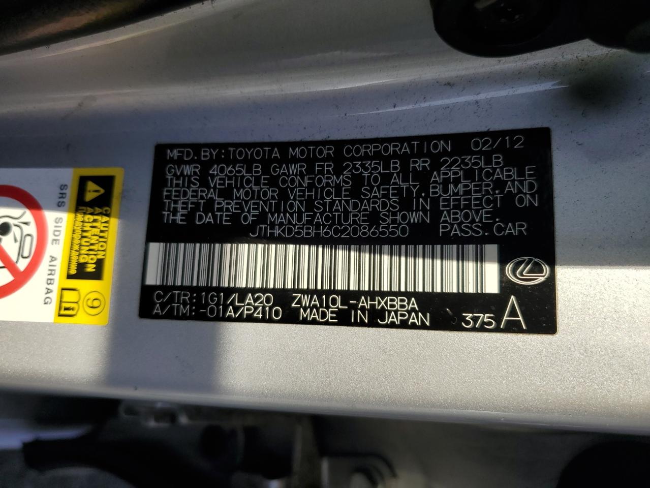 2012 LEXUS CT 200H - JTHKD5BH6C2086550, колір - Срібний, 1.8, Гібрид, із США