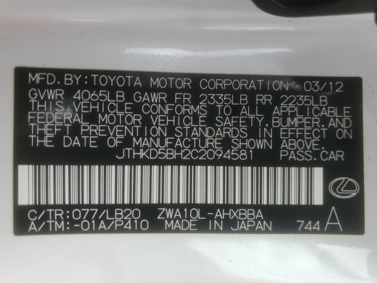 2012 LEXUS CT 200H - JTHKD5BH2C2094581, колір - Білий, 1.8, Гібрид, із США