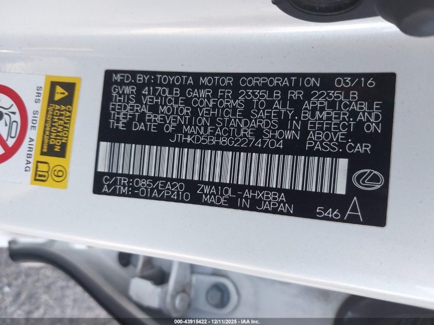 2016 LEXUS CT 200H - JTHKD5BH8G2274704, колір - Білий, 1.8, Гібрид, Передній привід із США