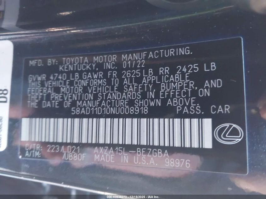 2022 LEXUS ES 250 - 58AD11D10NU008918, колір - Чорний, 2.5, Бензин, Повний привід із США