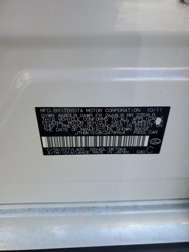 2012 LEXUS ES 350 - JTHBK1EG8C2478964, колір - Білий, 3.5, Бензин, із США