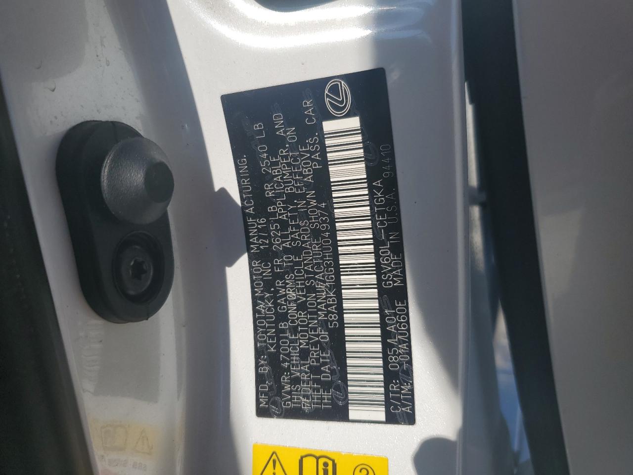 2017 LEXUS ES 350 - 58ABK1GG3HU049374, колір - Білий, 3.5, Бензин, із США