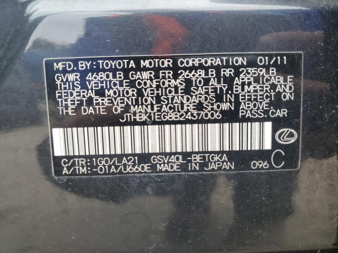 Колір ЧорнийЦиліндри 6VIN JTHBK1EG8B2437006Стан Заводиться та їде (перевірено)Ушкодження Передня або задняДата аукціона 2025-10-28