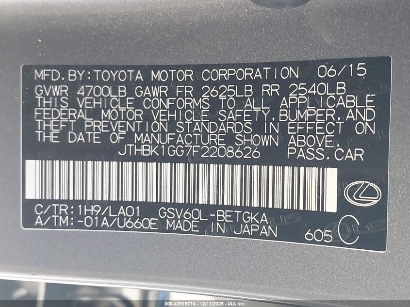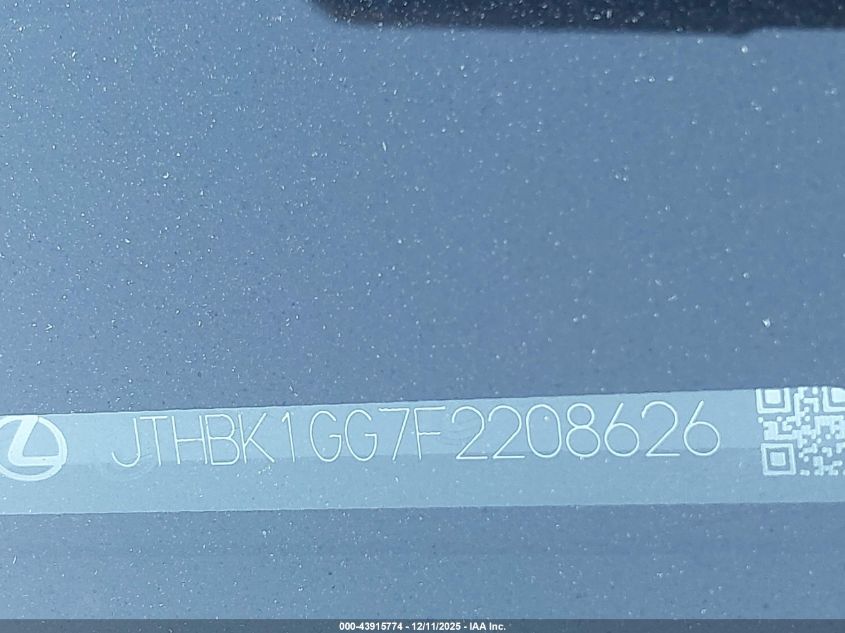 Колір СірийЦиліндри 6Привід Передній привідVIN JTHBK1GG7F2208626Стан СтаціонарноУшкодження Передня і задня