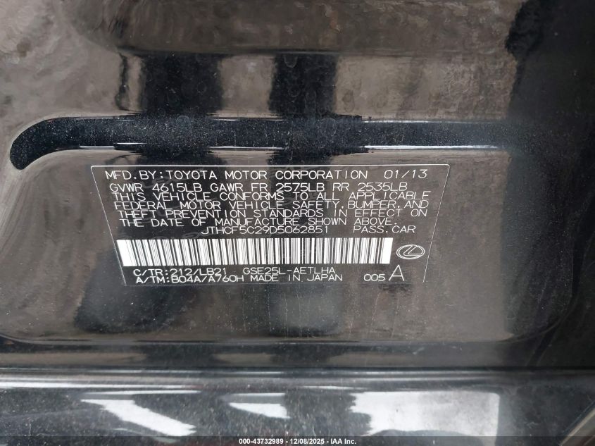2013 LEXUS IS 250 - JTHCF5C29D5062851, колір - Чорний, 2.5, Бензин, Повний привід із США