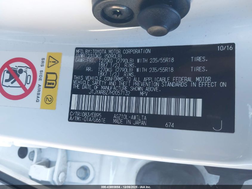 Колір БілийЦиліндри 4Привід Передній привідVIN JTJYARBZ7H2057132Стан НевідомоУшкодження Передня або задня