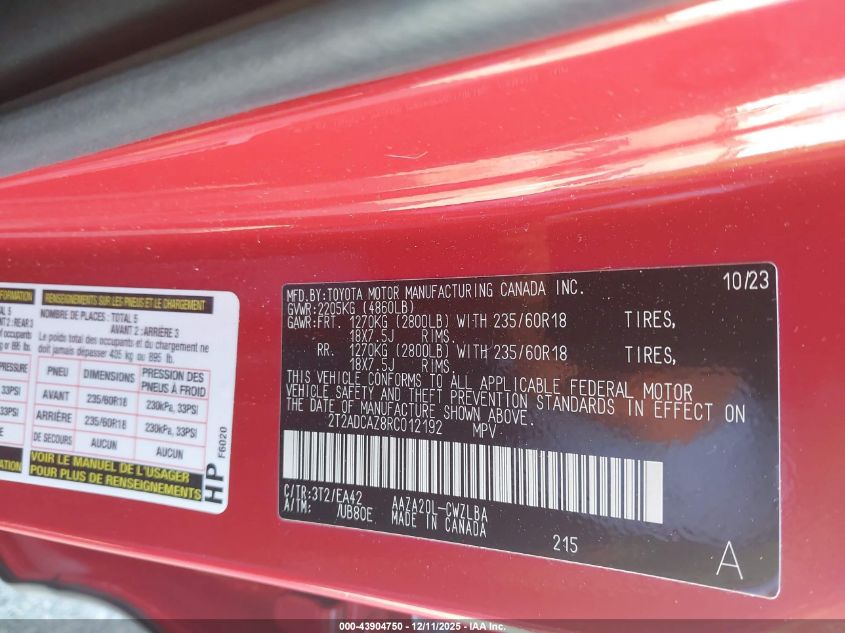 Колір ЧервонийЦиліндри 4Привід Передній привідVIN 2T2ADCAZ8RC012192Стан ЗаводитьсяУшкодження Ліва сторона