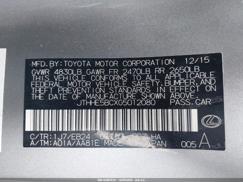 Колір СірийЦиліндри 6Привід Задній привідVIN JTHHE5BCXG5012080Стан Заводиться та їде (перевірено)Ушкодження Передня або задня