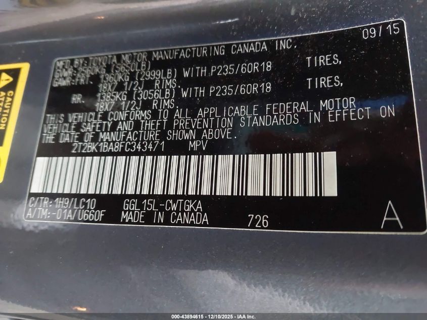 Колір СірийЦиліндри 6Привід Повний привідVIN 2T2BK1BA8FC343471Стан СтаціонарноУшкодження Передня права