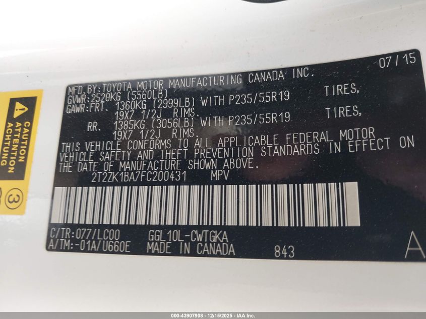 Колір БілийЦиліндри 6Привід Передній привідVIN 2T2ZK1BA7FC200431Стан Заводиться та їде (перевірено)Ушкодження Передня або задня