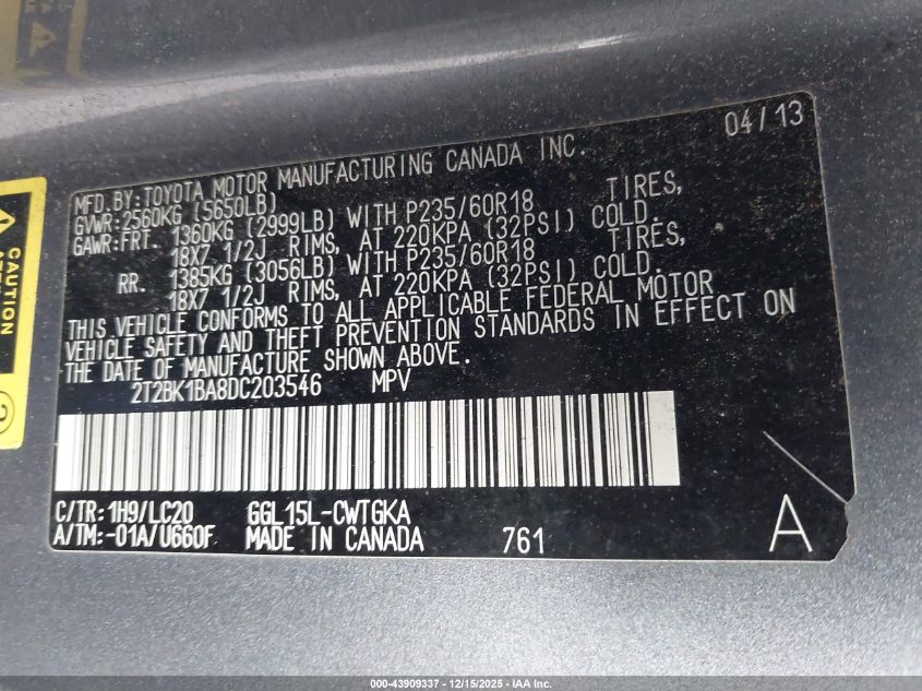 Колір СірийЦиліндри 6Привід Повний привідVIN 2T2BK1BA8DC203546Стан СтаціонарноУшкодження Передня або задня