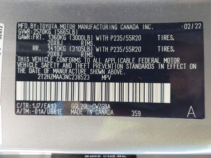 Колір СірийЦиліндри 6Привід Передній привідVIN 2T2HZMAA3NC238523Стан СтаціонарноУшкодження Перекидання