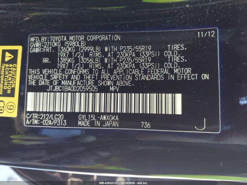 Колір ЧорнийЦиліндри 6Привід Повний привідVIN JTJBC1BA0D2059505Стан СтаціонарноУшкодження Передня або задня