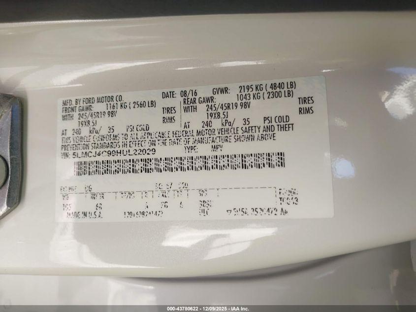 2017 LINCOLN MKC - 5LMCJ4C99HUL22029, колір - Білий, 2.0, Бензин, Передній привід із США