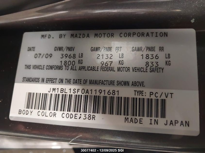 Колір СірийЦиліндри 4Привід Передній привідVIN JM1BL1SF0A1191681Стан Заводиться та їде (перевірено)Ушкодження Передня праваДата аукціона 2025-12-17